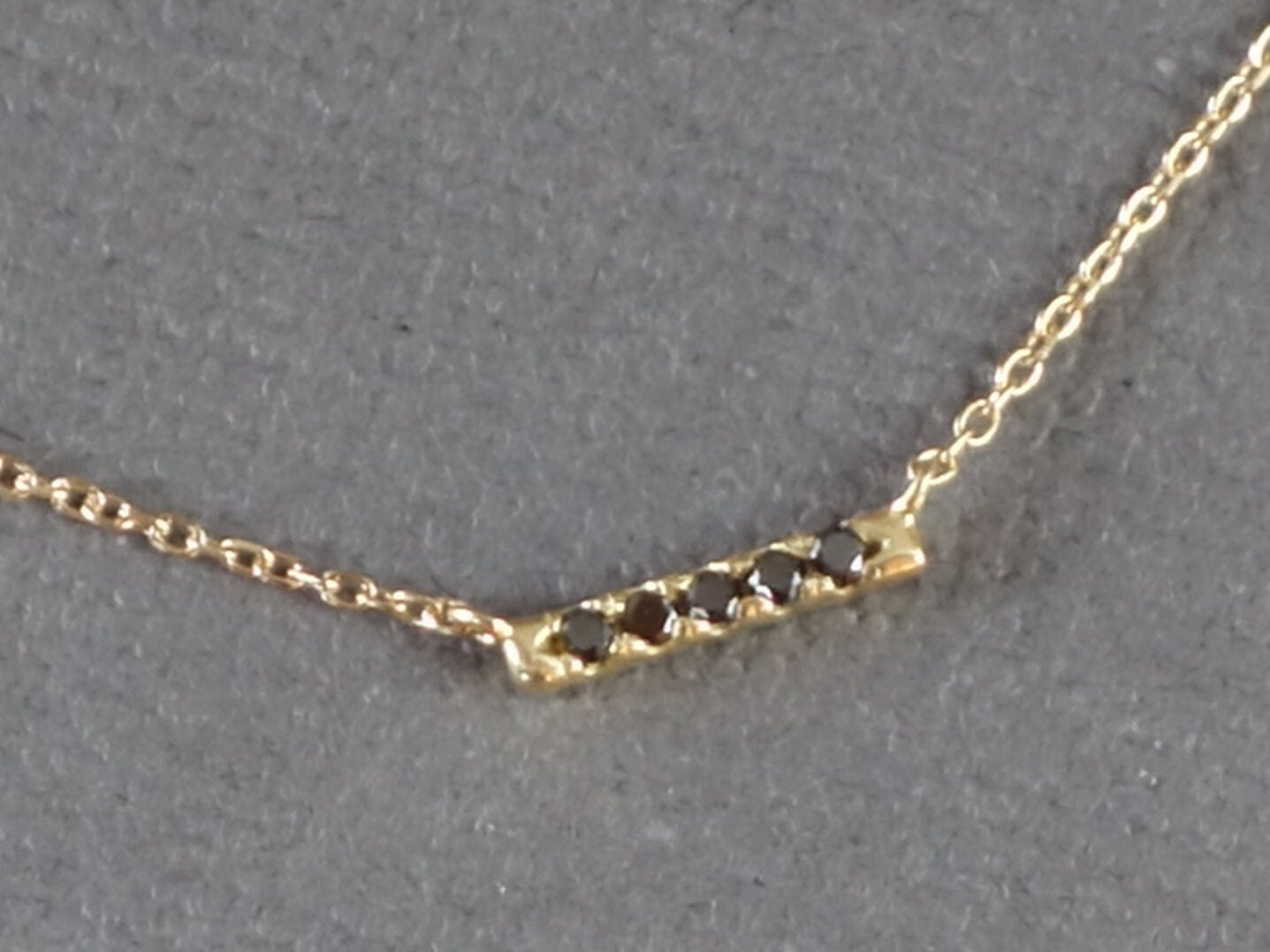 A solid 14k yellow gold bar set with round black diamonds. The diamonds are hand set and secured by prongs to allow the beauty of the black diamond to show while contrasting with the yellow gold of their setting. Perfect for everyday or to add to a layered ensemble.