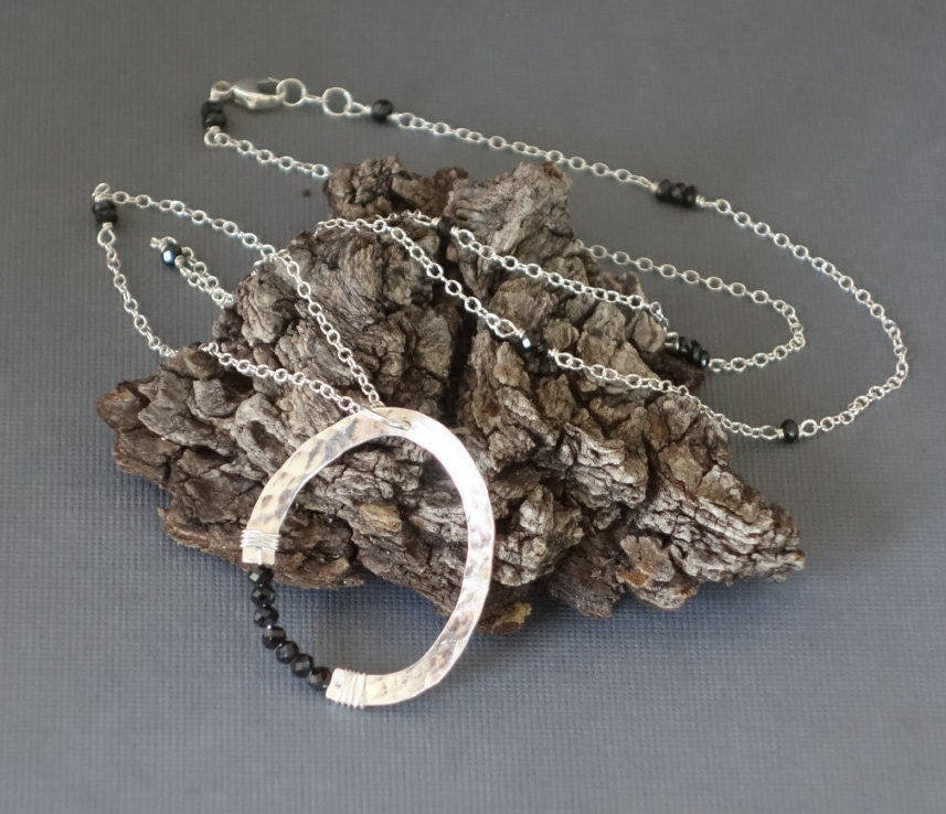 A long gemstone and chain necklace with an organic pendant. The organic shape is hand formed, textured and then polished to a high shine. Faceted black spinel stones extend and complete the organic shape and provide a pop of color.